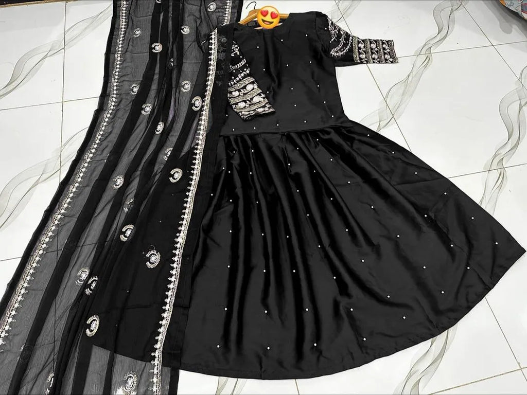 The top features pearl-embroidered sleeves with a flattering fit (21-inch length, 20-inch chest), while the flared skirt reaches 37–38 inches, creating a dramatic silhouette. The chiffon dupatta, also beautifully embroidered, adds a graceful finishing touch. Designed for comfort and style, this set allows freedom of movement while maintaining a luxurious appearance. Ideal for formal gatherings, festive events, or special occasions, this 3-piece set is a must-have for any woman’s wardrobe.